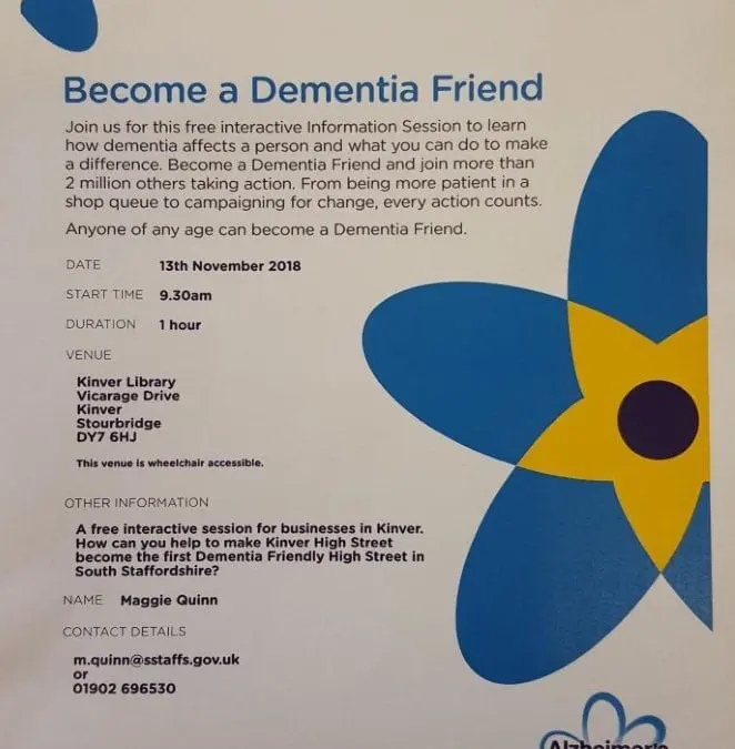 Did you know that anyone can become a Dementia Friend? Everyone can help in some way to enable a greater quality of life for our neighbours living with dementia. There is currently a drive to see whether Kinver can offer the first Dementia Friendly High Street in South Staffordshire.